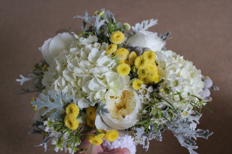 Bridal Bouquet: White garden roses, dusty miller, silver brunia berries, feverfew, waxflower and hydrangea