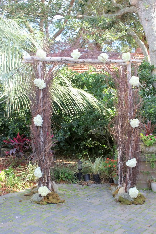{Ceremony Arbor: Paper Birch Poles & Twigs, Curly Willow, Grapevine and White Hydrangeas}