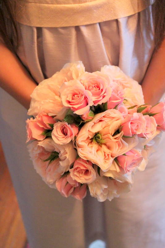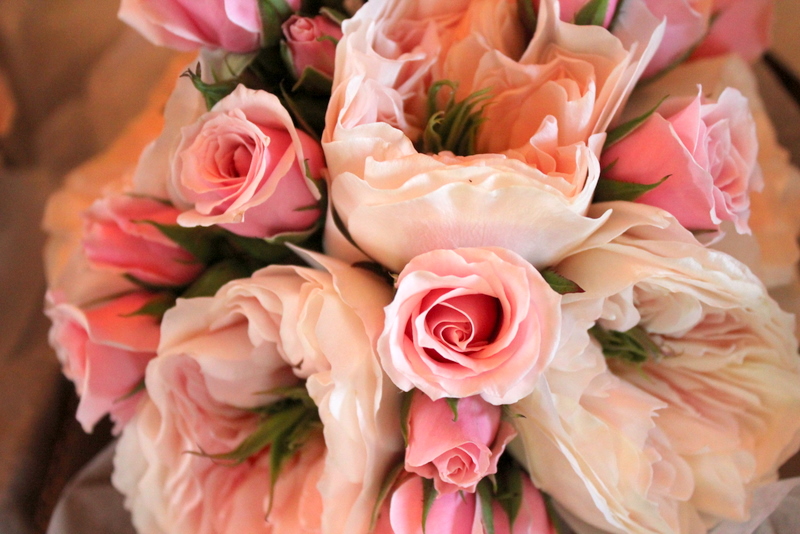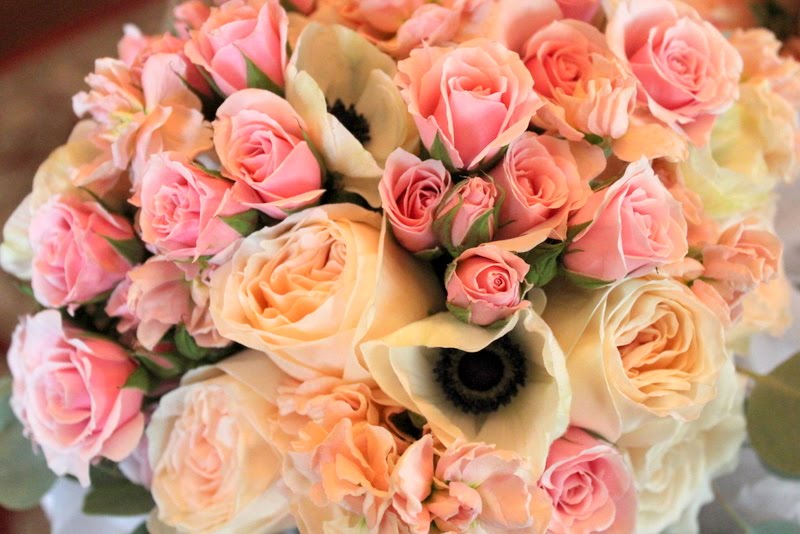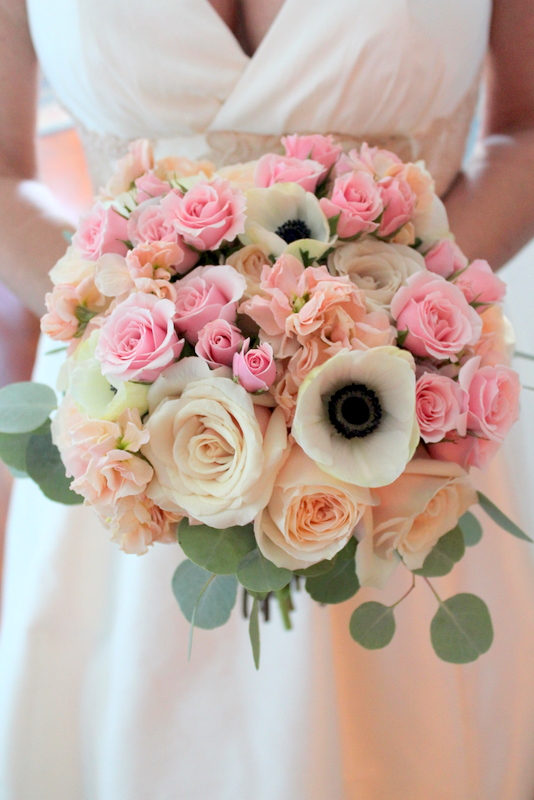 {Bride’s Bouquet: Sahara Roses, Mythos Garden Roses, Anemone, Pink Spray Roses, Peach Stock and Silver Dollar Eucalyptus}