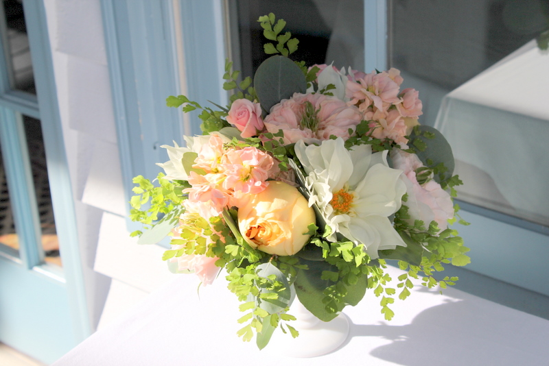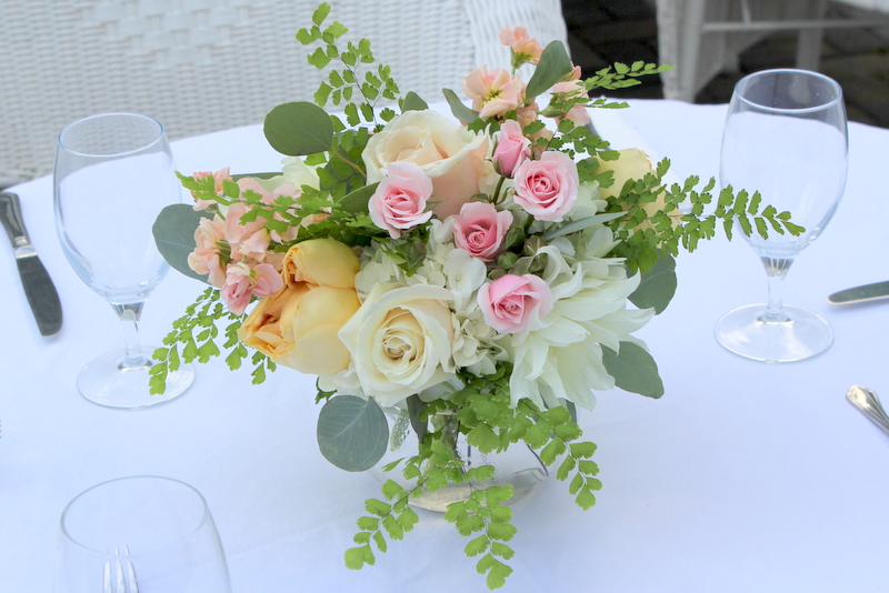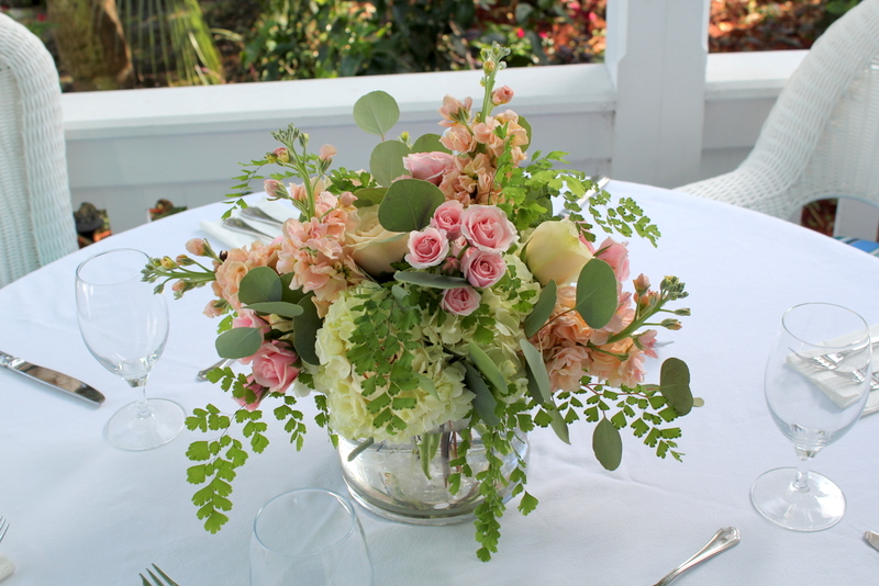 {Centerpiece: White Hydrangea, Sahara Roses, Peach Stock, Pink Spray Roses, Maidenhair Fern and Silver Dollar Eucalyptus}