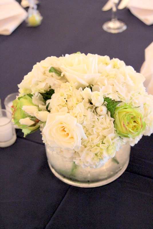 Cylinder vases were filled with white hydrangea, white roses, white spray roses and green roses for some of the tables.