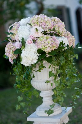 Flowers were primarily ‘Auswater’ garden roses along with ‘Patience’ garden roses, pink hydrangea, pink ranunculus, pink spray roses, white hydrangea, white ranunculus and white spray roses.