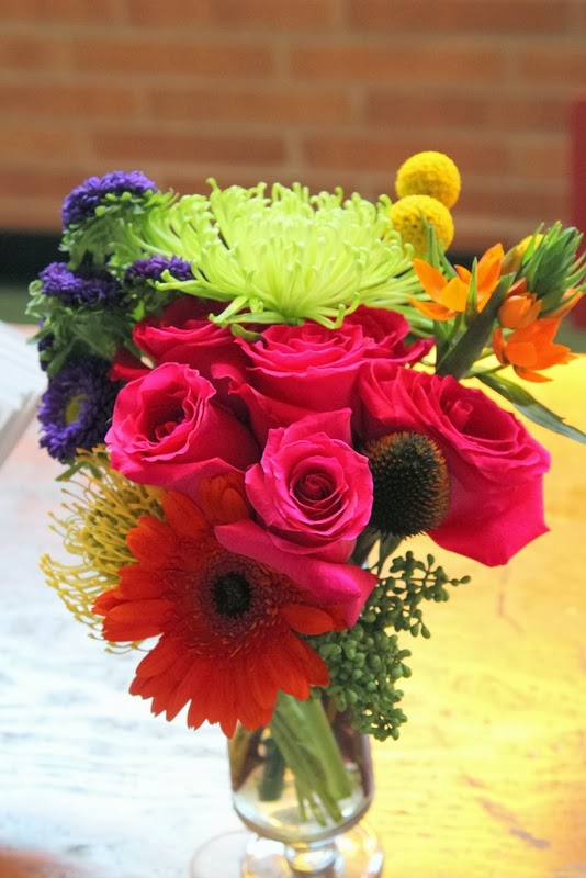 {Centerpieces were bubble bowls with a mix of bright colorful blooms}