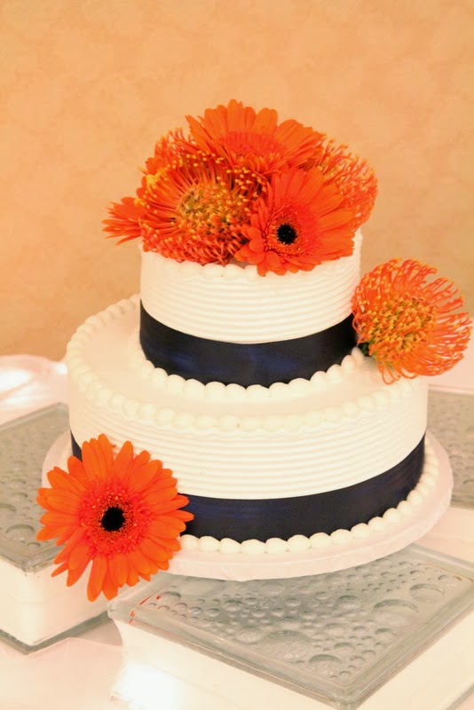 {We added orange gerbera daisies and pincushion protea to the cake}