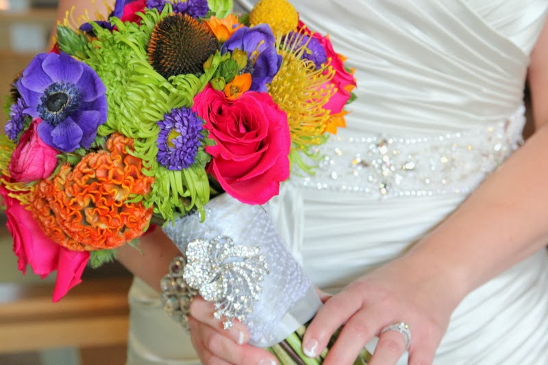 {The bride carried a bright bouquet of hot pink roses, hot pink ranunculus, orange cocksomb, orange dubium, yellow billy balls, yellow pincushion protea, echinacea pods, purple anemone, purple matsumoto asters, green thistle and green spider mums.}