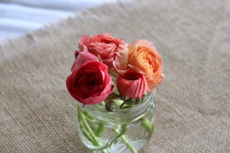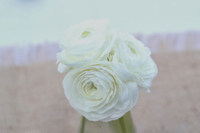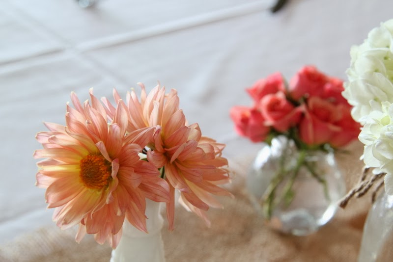 {A mix of vessels were added to the tables. Dahlias, roses, spray roses, hydrangea, ranunculus and anemones were used.}
