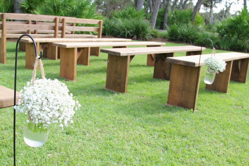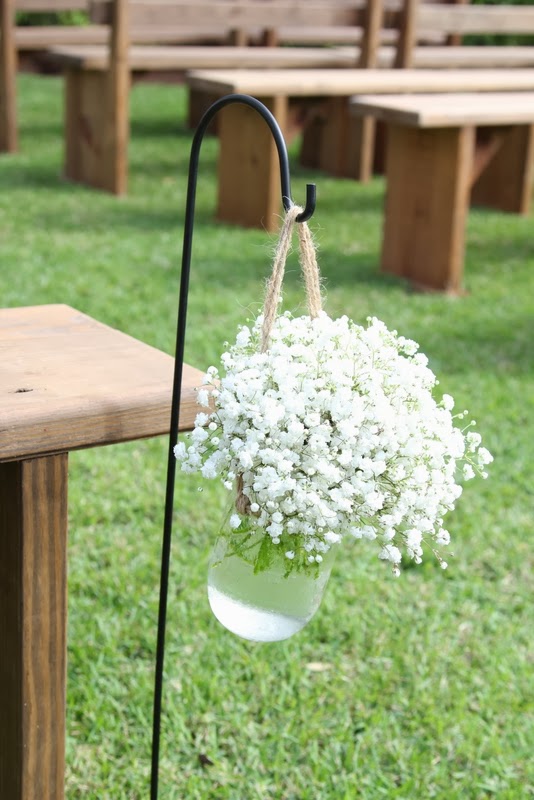 {Mason jars with baby’s breath were hung from shepherd’s hooks at the end of the aisle.}