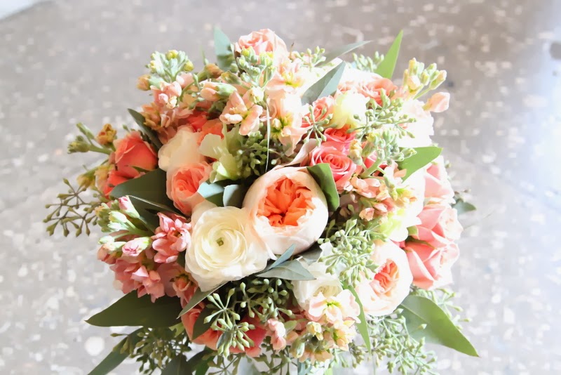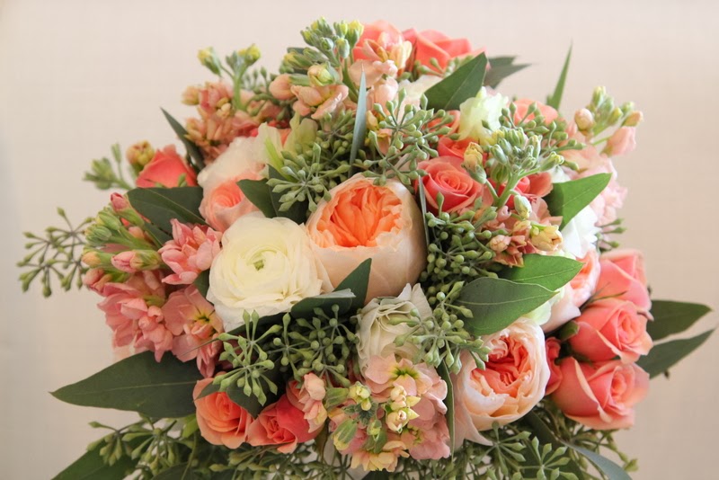 {The bride carried a bouquet of peach garden roses, coral spray roses, peach stock, white ranunculus, white anemone and seeded eucalyptus.}